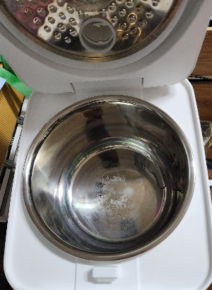 ✅ 관리 팁: 이 얼룩은 일반적인 세제로는 잘 지워지지 않으며, 구연산이나 식초를 물에 타서 가습기를 작동시키거나 불려 놓은 후 닦아주면 깨끗하게 제거됩니다. 스테인리스 내솥이라 청소 도구를 이용해 닦아도 흠집 걱정이 적다는 것은 장점입니다.
